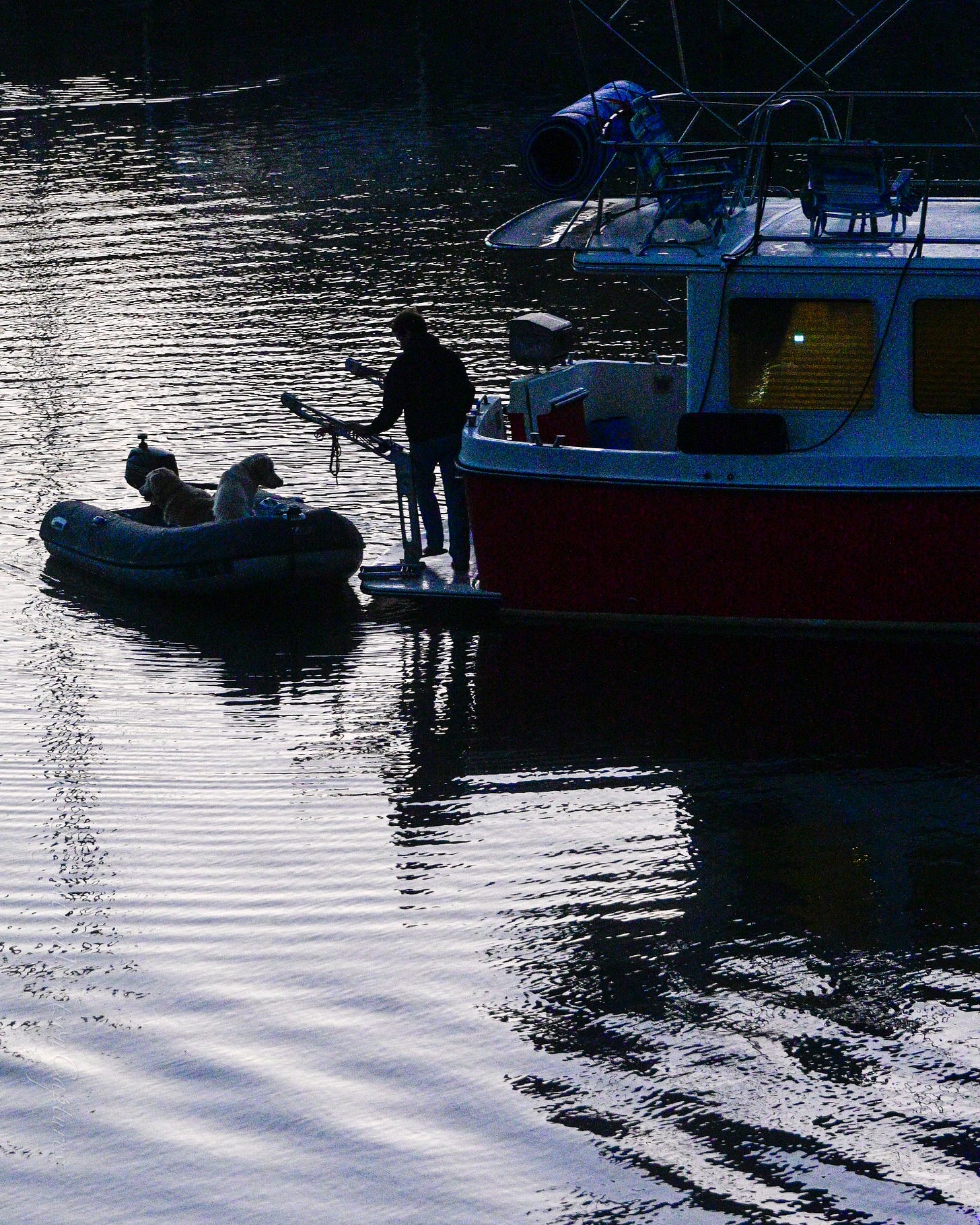 It was a spectacular weekend for the powerboat show here in Annapolis, so on to the sailboats. Perhaps my favorite picture of the weekend was this fellow, moored off our balcony, taking his two yellow labs ashore to do their “do” early Sunday morning; they were back within ten minutes, then sailed off into the Bay.