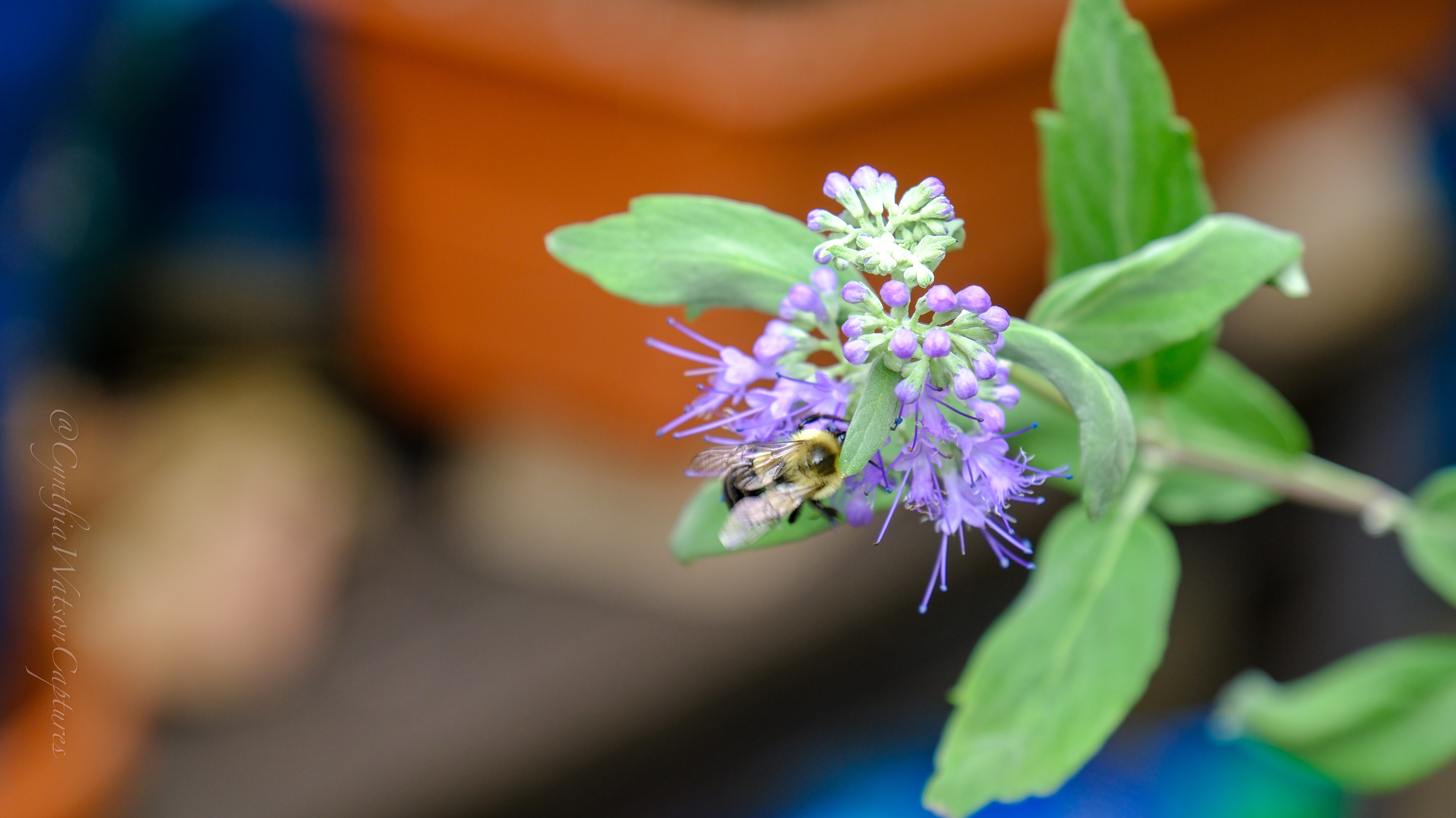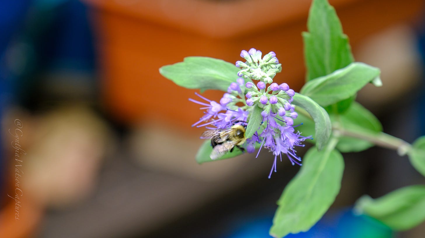 An Eastern bumblebee registers her thoughts on my plants on the patio—all views are welcome, after all.